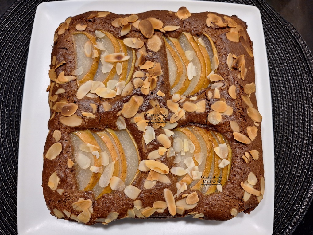 Представете си пухкав, шоколадов блат, в който нежно се крият сочни парченца круша. Отгоре се усещат хрупкавите филирани бадеми, които правят всяка хапка още по-специална. Този десерт е лесен за приготвяне, бърз и, разбира се, напълно без глутен и без яйца.