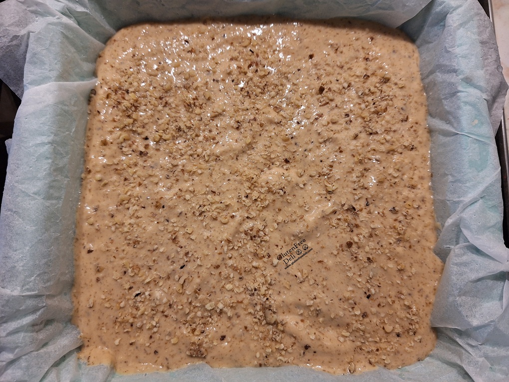 Изсипете тестото във подготвената тавичка и по желание поръсете с орехи.
