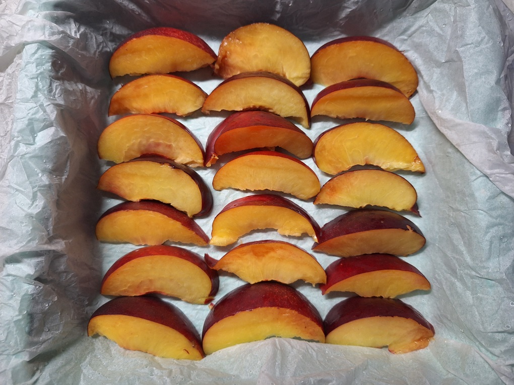 В тавичка (20*20см) сложете хартия за печене и подредете нарязаните нектарини.