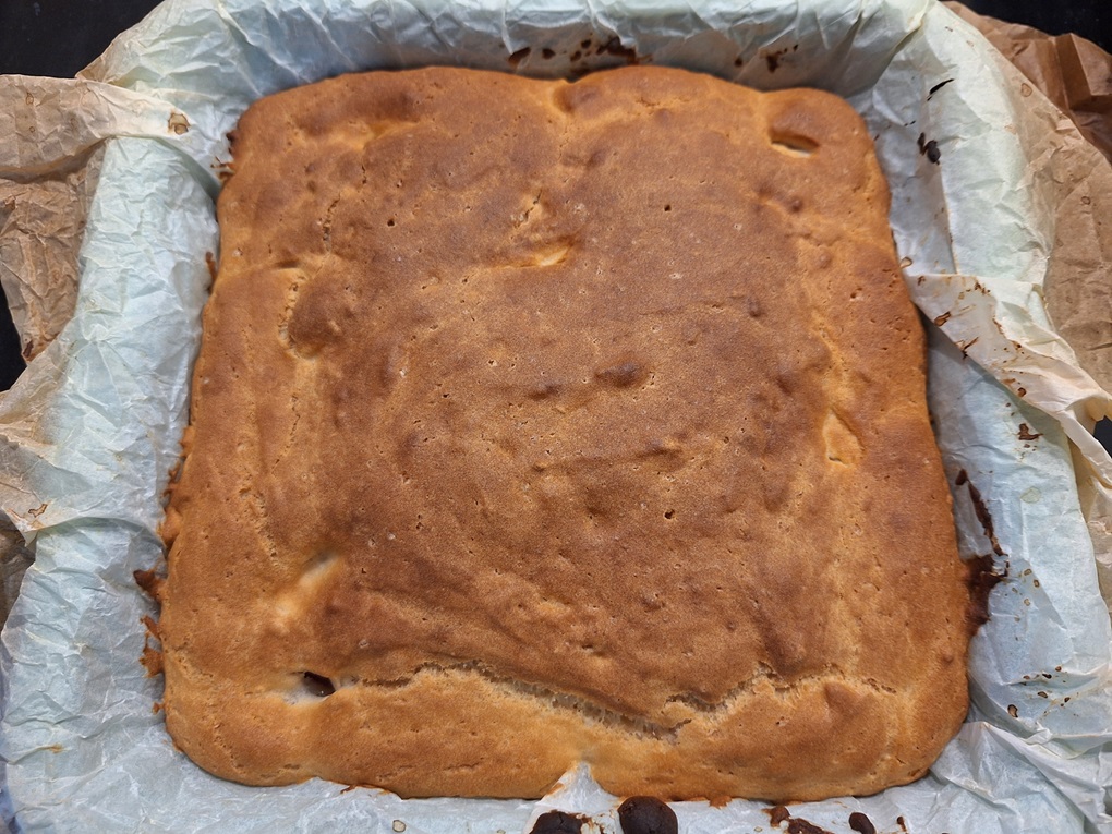 Готовият сладкиш оставете да изстине за 10тина минути в тавичката, след което обърнете върху чиния за сервиране и внимателно махнете хартията за печене.