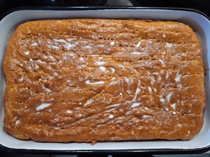 2. Охладеният блат се поставя във формата за сервиране. С дървено шишче или вилица се правят дупки по целия блат.